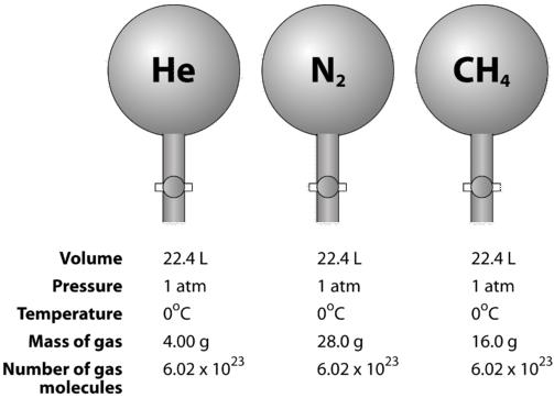 De onderstaande figuur illustreert hoe het molaire volume kan worden gezien bij het vergelijken van verschillende gassen. De gassen helium (links), stikstof (links), en methaan (links) zijn bij STP. Elk bevat 1 mol of 6,02 maal 1023 deeltjes. De massa van elk gas is echter anders en komt overeen met de molaire massa van dat gas: \4,00 voor He, 28,0 voor N2 en 16,0 voor CH4.