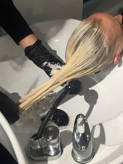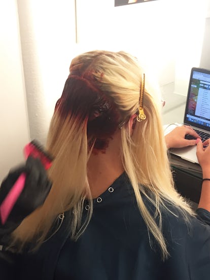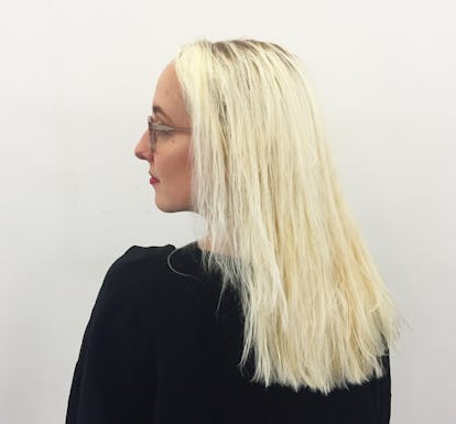 Prima di iniziare, ho avvertito Bodt che non mi lavavo i capelli da cinque giorni, ma mi ha assicurato che era una buona cosa. La candeggina può bruciare il cuoio capelluto se lo tocca, ma Bodt mi ha detto che qualsiasi olio accumulato che sei in grado di accumulare aiuterà a prevenire che ciò accada. Indeed, I didn’t feel even the slightest burning during my color session.
