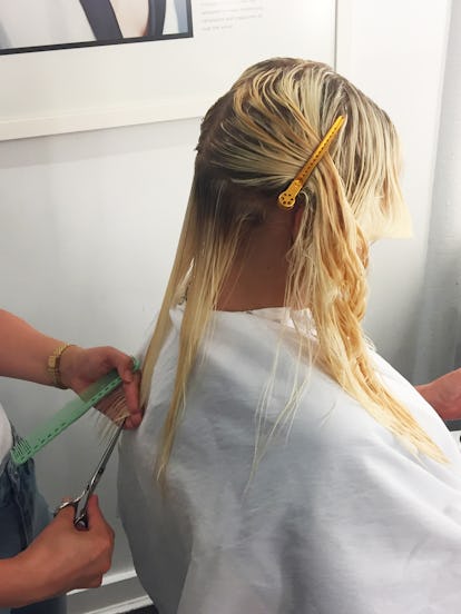 Probabilmente non c’è bisogno che ti dica che passare dal tuo colore naturale di capelli al rosa è una sorta di cambiamento enorme. Per i migliori risultati in assoluto, vorrai un taglio di capelli lo stesso giorno. Quel taglio non cambierà esattamente il colore, ma i tuoi capelli sembreranno più sani, il che significa che è più probabile che tu sia entusiasta del look finale. Bodt ha portato Melissa Parizot per darmi una spuntatina, e ha fatto tutta la differenza del mondo.